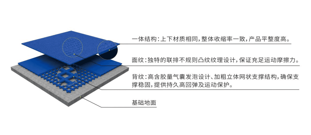 上下一体通体材料,产品整体含胶量高达30%以上,抗撕裂性高;结合独有的卷材技术及配方,优化分子结构,具备出色的体感柔韧性及高弹性;有效降低传统预制型跑道接缝处崩裂、弯道裂板。